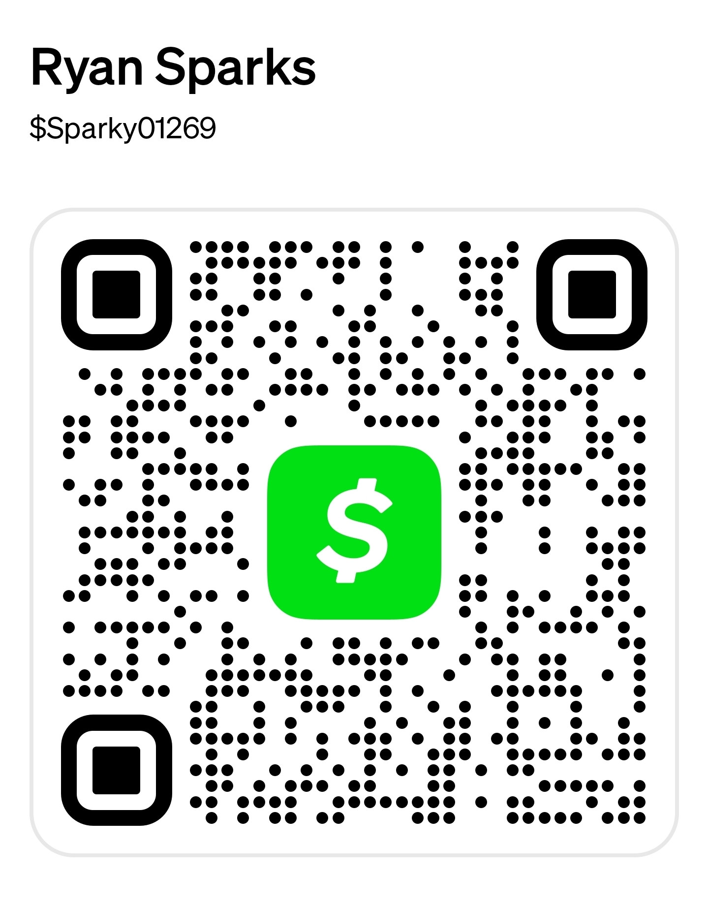 Paying with Cash App is quick and easy. Our official Cash App cashtag is: $Sparky01269. You can either copy and paste this cashtag directly into Cash App, or use the QR option in the app to scan.